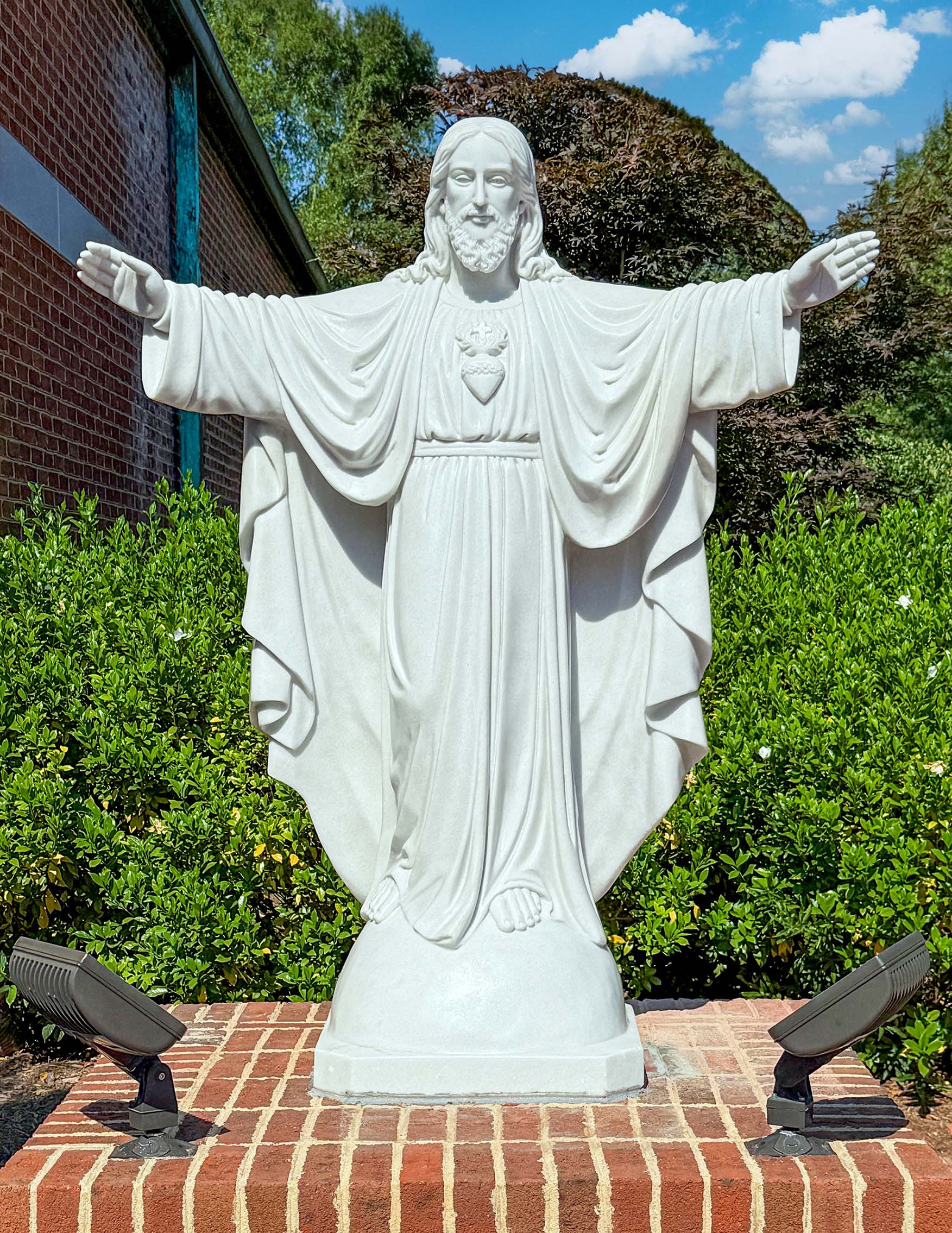 Our crew lent their expert skills to carefully place the 1,245-pound marble statue within the parish columbarium, turning a vision of faith into a beautiful reality. The statue was blessed by Fr. Scott McCue on September 11, adding a layer of profound meaning as a symbol of Christ’s love and mercy for all.